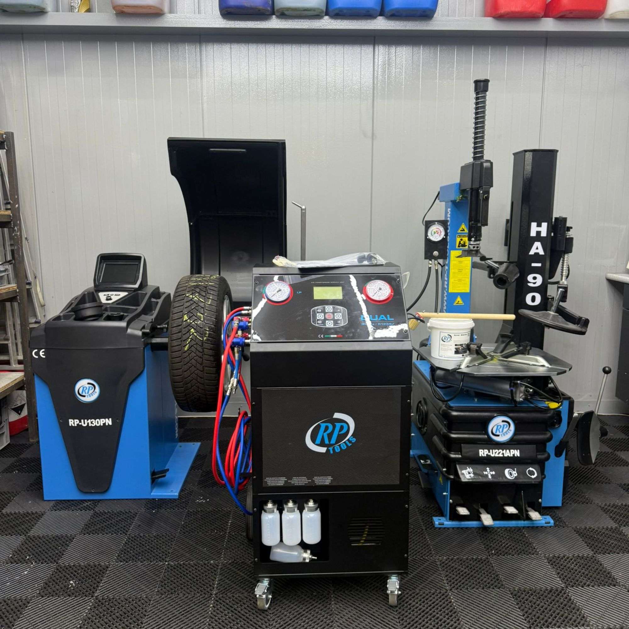 De- en monteermachine van RP-TOOLS voor effi ciënt en zorgvuldig omgaan met banden en velgen van auto’s, bestelwagens en motorfi etsen.